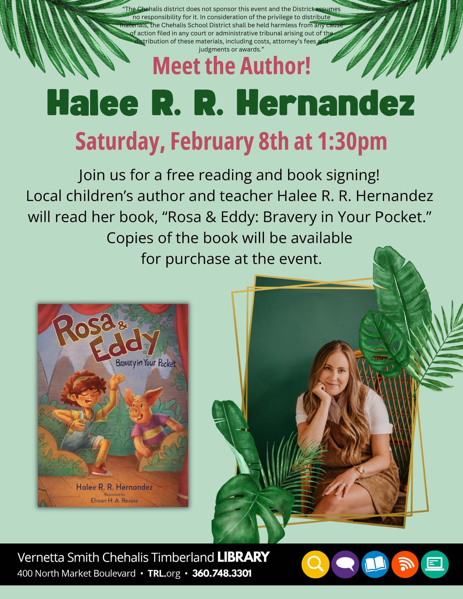 Hey Chehalis families, looking for something to do this weekend? Our very own Orin Smith Elementary teacher Halee Karnofski (writing under the pen name Halee R. R. Hernandez) will be featured at a Meet the Author event this Saturday at the Vernetta Smith Timberland Regional Library. Come check out the newest book in her series "Rosa & Eddy: Bravery in Your Pocket".